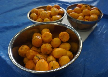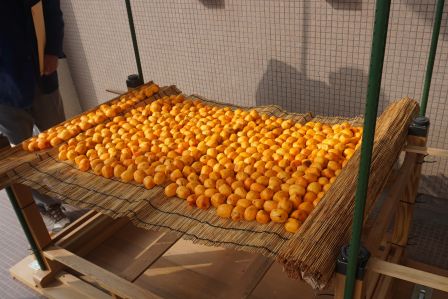 次は、外に出て柿を干していきます。腐ったりカビが生えたりしないように、風通しのよいゴザの上に、ひとつひとつ並べました。