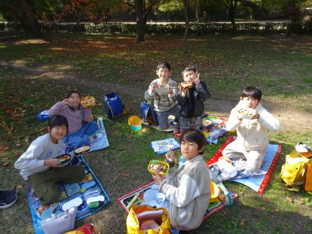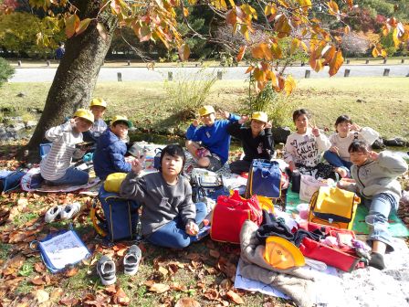 その後、御所に移動してお昼ごはん。紅葉が美しい自然の中で、みんなでおいしくお弁当をいただきました。