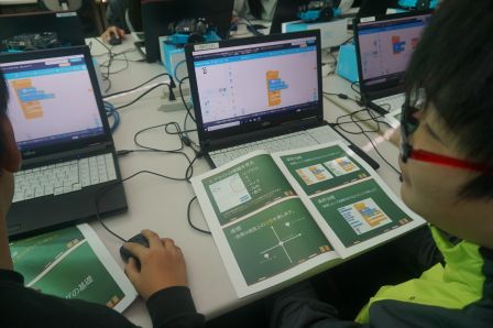 まずは、プログラミングの基礎から。デスクトップのパンダのアイコンを使って、それを動かすための指示の出し方を教わります。子どもたちは、すぐに要領をつかみ、「〇歩進む」や「回転する」「壁にあたるとUターンする」などの指示を組み合わせて、自在にパンダを操ります。