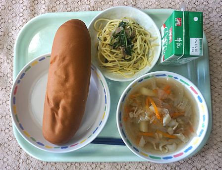 ・ミルクパン ・牛乳 ・オニオンスープ ・水菜のスパゲティ