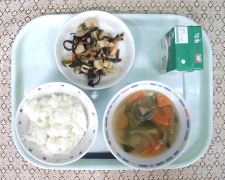 今日の給食今日の給食は「チャンプルー」です。沖縄でよく食べられている家庭料理のひとつです。豆腐や肉を野菜と炒めて作る料理のことを、沖縄では「チャンプルー」と呼びます。具を何種類も入れて作るので、いろんな栄養を一度にとることができます。今日は、もやしときくらげも入っているので、シャキシャキ、コリコリの食感を楽しみながら食べてください。