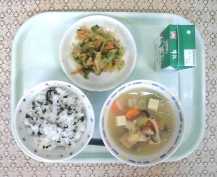 ・わかめごはん ・牛乳 ・石狩汁 ・キャベツと小松菜の土佐和え