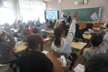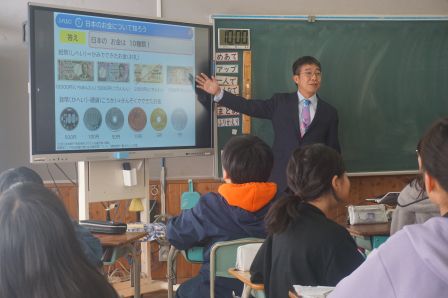 本日の3・4時間目に、5年生が、お金について学ぶ出前授業を受けました。外部講師としてお招きしたのは、「きょうと金融リテラシー教室」室長の中野靖之さん。中野さんは証券会社に20年以上勤務された経験のある、まさにお金のプロフェッショナル。お金の使い方や貯め方、世の中のお金の流れやお金に関するトラブルの防止法まで、幅広く教えていただきました。