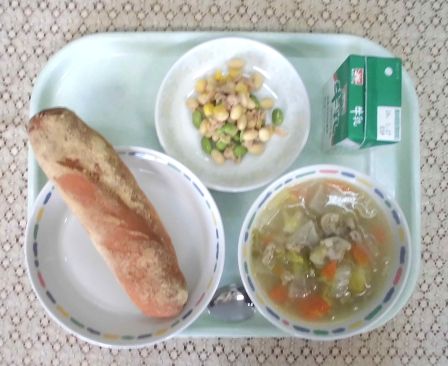 ・きなこパン ・牛乳 ・冬野菜のスープ煮 ・まめまめサラダ