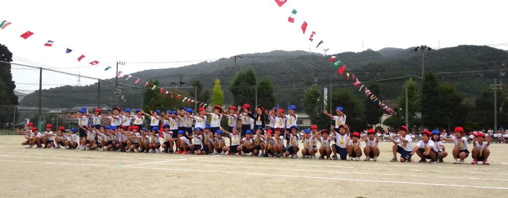 さあ、運動会のトリを飾るのは、やっぱり高学年の団体演技。前半は力強いダンスと組体操、後半はフラッグを使ったマスゲームです。全員で気合いの入ったかけ声を合わせながら、最後まで見事にやり切りました。これまでの練習の成果があらわれた、会心の演技だったと思います。5・6年生のみなさん、感動をありがとう!