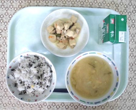 ・十六穀わかめごはん ・牛乳 ・キャベツのみそ汁 ・高野豆腐の煮物