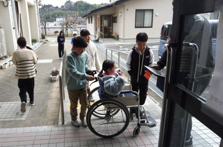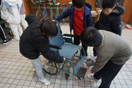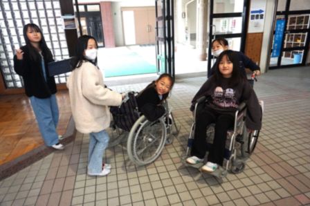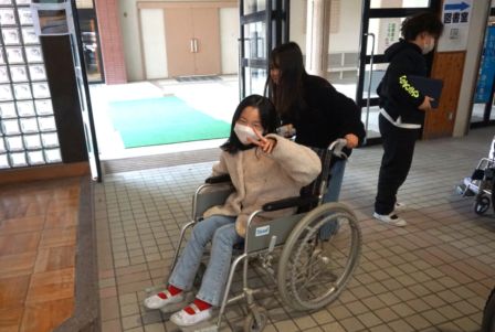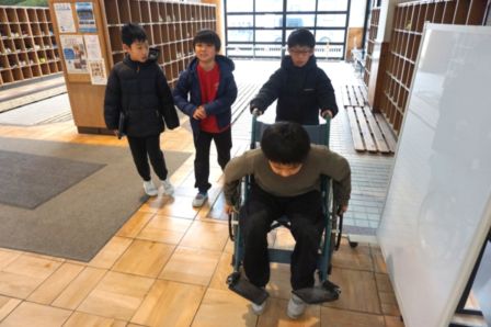 3・4人のグループで、役割を交代しながら、車いすの体験をしました。介助役の人は、乗っている人のことを考えて丁寧に車椅子を扱い、やさしく声を掛けながら押すことができました。
