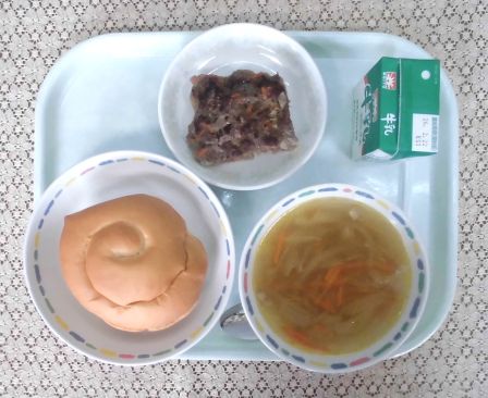 ・バーガーパン ・牛乳 ・オニオンスープ ・ミートローフ