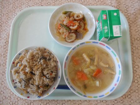 ・ひじきごはん ・牛乳 ・きゃべつのみそ汁 ・大根のそぼろ煮