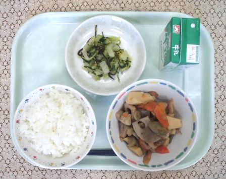 今日の給食は、「筑前煮」です。筑前煮は、福岡県が発祥とされる郷土料理です。もともとは「がめ煮」と呼ばれ、祝い事や人が集まるときによく作られてきました。鶏肉や根菜を油で炒めてから煮るのが特徴で、これによりコクが出て煮崩れもしにくくなります。れんこんは「先が見通せる」、里芋は「子宝に恵まれる」など、縁起のよい意味をもつ食材が多く使われています。よく噛んで、素材の味を楽しみながら食べてください。