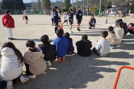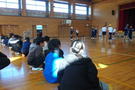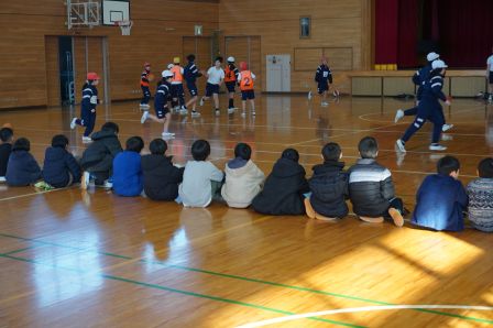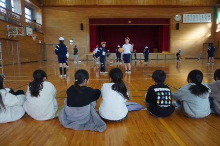 続いて体育館に移動します。ここでは、体育館スポーツクラブが活動しています。この日はみんなで協力しながら、バスケットボールをしている様子を見学しました。