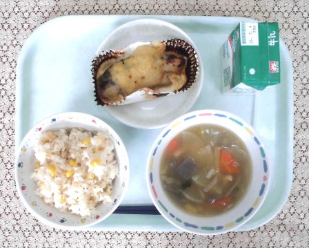 ・とうもろこしごはん ・牛乳 ・のっぺい汁 ・魚のゆずみぞれ焼き