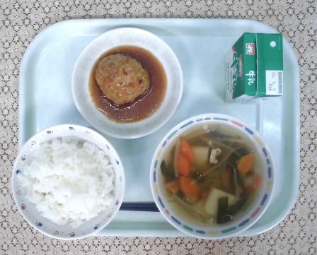 今日の給食は「五目汁」です。五目炒めや五目ごはんなど、「五目」という名前のつく料理は多いですね。この「五目」には、5つの色の食材が入っているという意味があります。今日のお汁にも、野菜や肉、かまぼこなど、いろいろな種類の具材が入っていて、栄養もたっぷりです。しっかり食べて、丈夫な体をつくりましょう。