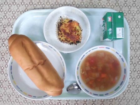 ・ミルクパン ・牛乳 ・豆と雑穀のミネストローネ ・おからグラタン