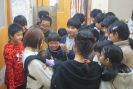 先生は、今の6年生が2年生の時の担任でもあるので、子どもたちもよく知っています。講義が終わると、みんなで先生とかわいい赤ちゃんを取り囲んでいました。