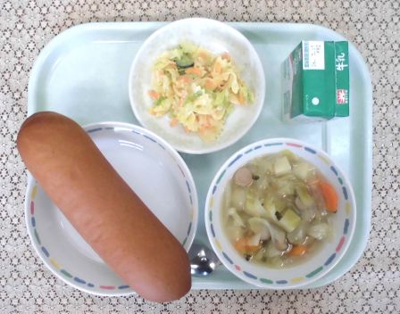 ・黒糖パン ・牛乳 ・スープ煮 ・パスタサラダ