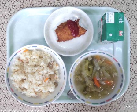 ・ウィンナーピラフ ・牛乳 ・白菜とブロッコリーのスープ ・チキンのフレーク揚げ