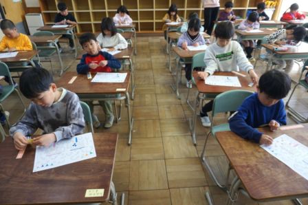 修了式のあった3月24日(火)の午後に、来年度本校に入学する保育園児・幼稚園児を対象に、小学校体験学習を行いました。今年度の1年担任の先生から、学校生活の基本的なルールを聞いたり、簡単な数の学習やシールを使ったワークシートをしたりしながら、楽しく30分程度の授業を受けました。園児達は、すぐに小学校の雰囲気に慣れ、時間が経つにつれて元気いっぱいに活動していました。