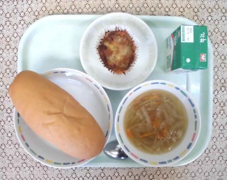 ・国産小麦パン ・牛乳 ・オニオンスープ ・ポテトのミートグラタン