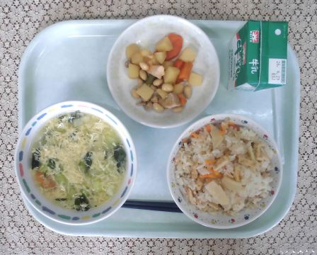 ・たけのこごはん ・牛乳 ・かき玉汁 ・五目煮豆