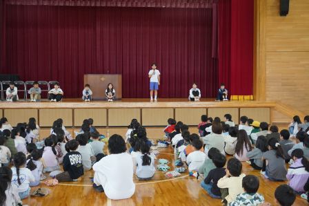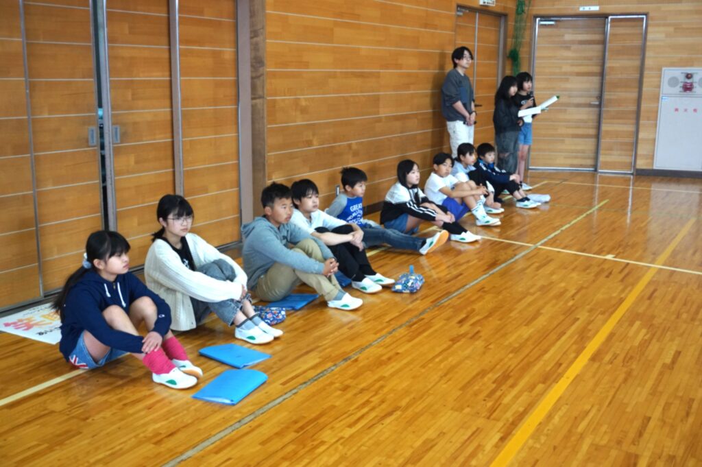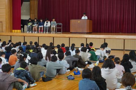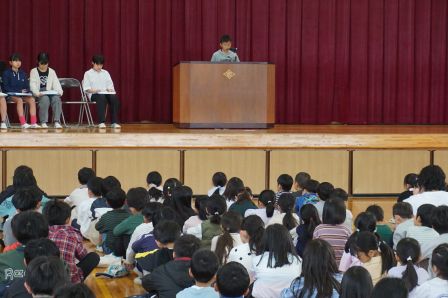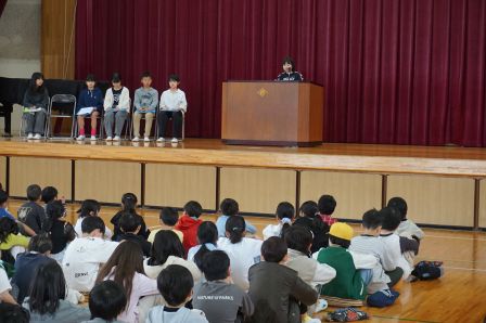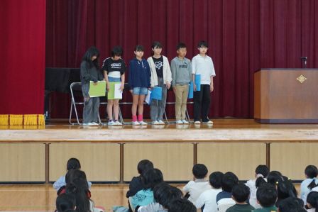 まずは、児童会本部役員のみなさんです。田原小学校をどんな学校にしたいか、そのためにどんな取組をがんばるのか、全校の前で自分の決意を表明しました。