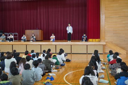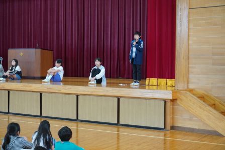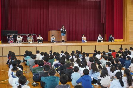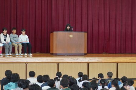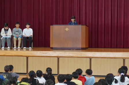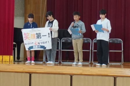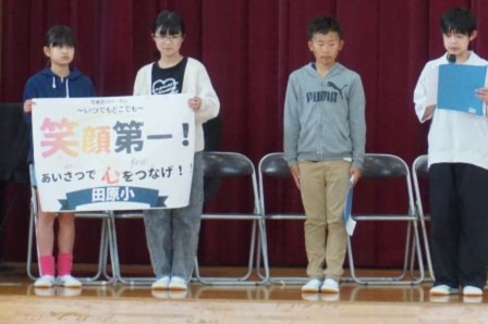 そして、児童会のスローガンを発表しました。『いつでもどこでも笑顔第一!あいさつで心をつなげ!』みんなで笑顔いっぱい、元気なあいさつの飛び交う、楽しい学校にしていきましょう。