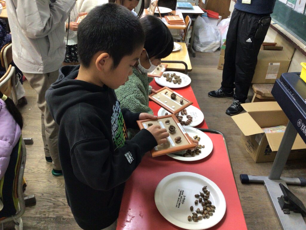 2年生 どんぐり図鑑づくり 寺小ニュース 2025.11.28 2年生は、どんぐりやまプロジェクトで講師の方や城陽市環境課の方々に来ていただき、環境教育の一環として「どんぐり」について学びました。はじめに、クイズを通してさまざまなどんぐりの特徴に触れ、楽しみながら理解を深めました。その後、6種類のどんぐり(クヌギ、コナラ、マテバシイ、ウバメガシ、アラカシ、シラカシ)を使って「どんぐり図鑑」を作成しました。子どもたちは、形や大きさの違いを確かめながら、素敵な図鑑を仕上げていました。 Post Views: 4