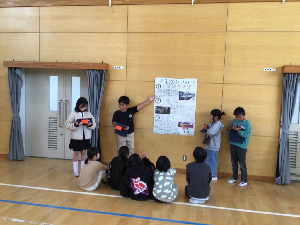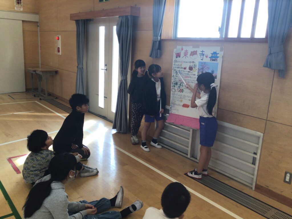 4年生社会科学年発表会 寺小ニュース 2025.12.03 12月1日(月)、4年生では、社会科の学習で取り組んできた「京都府の世界遺産調べ」について学年発表会を行いました。どのグループも丁寧に調べ、内容が見やすく分かりやすい資料にまとめられていました。また、発表では、クイズを取り入れたり、聞き手をよく見て話したりするなど、伝え方にもさまざまな工夫が見られました。どの発表も、世界遺産に実際に訪れてみたくなるような、興味深い内容でした。 Post Views: 6