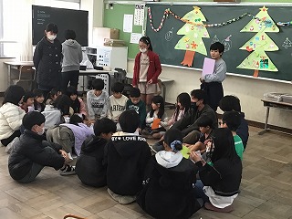 たてわり遊び 今日の様子から 2025.12.22 たてわり遊びがありました。まず、6年生が1年生を迎えに行きました。その後、フルーツバスケットや宝探しゲームをしたり、前もってそれぞれが作ったプレゼントを交換したりしました。どの教室もツリーや輪飾りできれいに装飾され、1年生から6年生まで笑顔がいっぱいあふれるすてきな時間となりました。 Post Views: 4