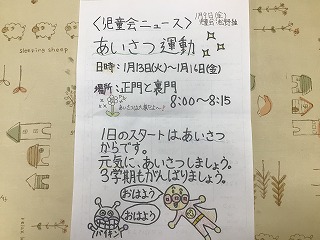あいさつ運動 今日の様子から 2026.01.21 1月13日(月)から16日(金)まで児童会本部のあいさつ運動がありました。児童会本部の子どもたちがしっかり大きな声で挨拶するので、他の子どもたちも自然と大きな声に・・・。学校は朝から活気にあふれていました。児童会ニュースにも「1日のスタートは、あいさつからです。元気にあいさつしましょう。3学期もがんばりましょう。あいさつは大事だよ。」と書かれています。児童会本部の皆さん、本当にお疲れ様、そしてありがとう。 Post Views: 4