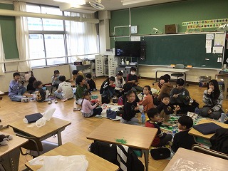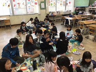 1・6年生が鴻の巣運動公園へ校外学習に行く予定だったのですが、残念ながら雨で延期になりました。そこで、1年生と6年生が一緒にお弁当を教室で食べていました。お家の方が作ってくださったお弁当をとても嬉しそうにほおばっていました。どのグループも温かい雰囲気の中、楽しそうに食べていました。