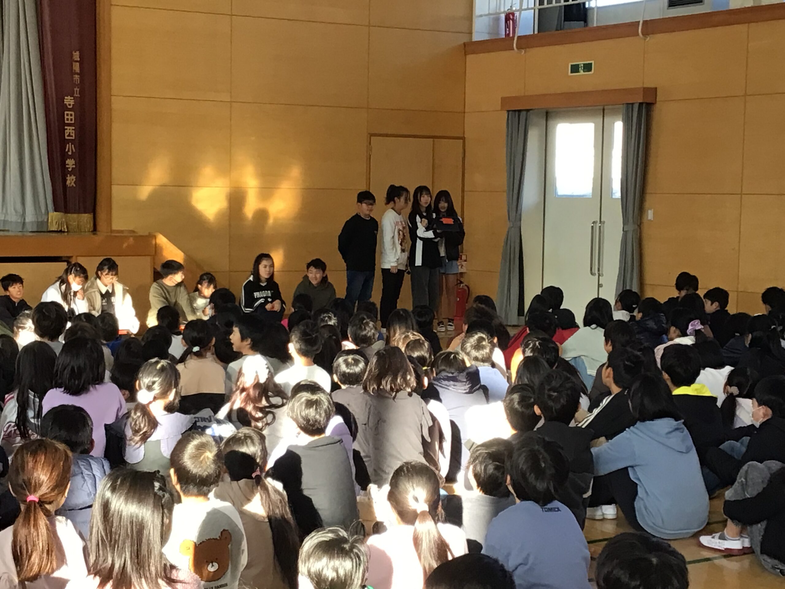 寺西っ子だより児童集会で各学級が人権を意識した「なかよし宣言」を行いました。自分たちの学級の現状を話し合い、改善した方がいいところやもっと良くしていきたいところなどを「なかよし宣言」として各学級の代表者が発表しました。「人の気持ちを考えて、プニプニ言葉を使います。」「友達の発表に反応を返します。」など、各学級がより良い仲間となれるよう一生懸命に考えました。これからこの宣言を意識して取り組んでいきます。
