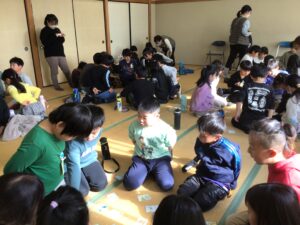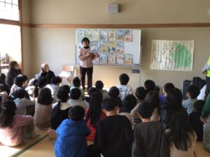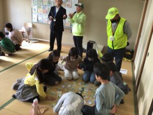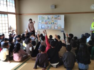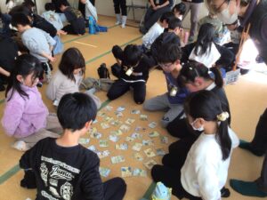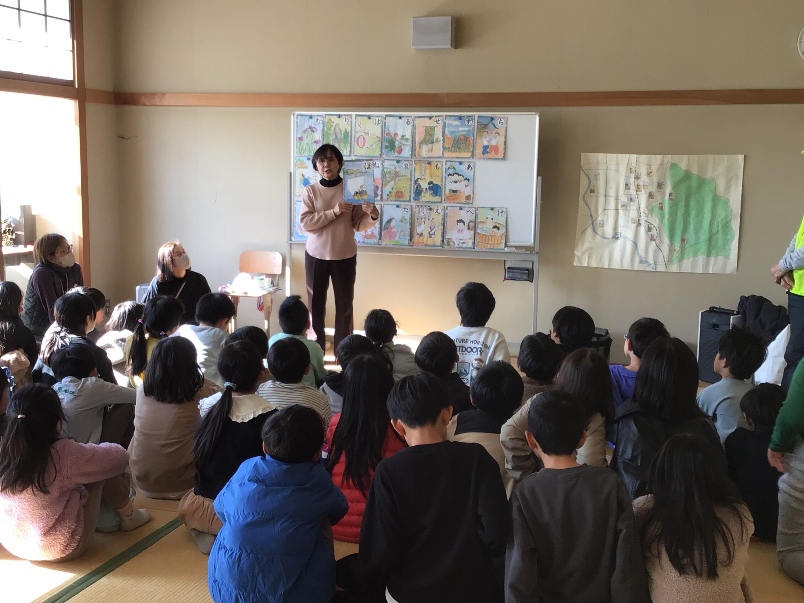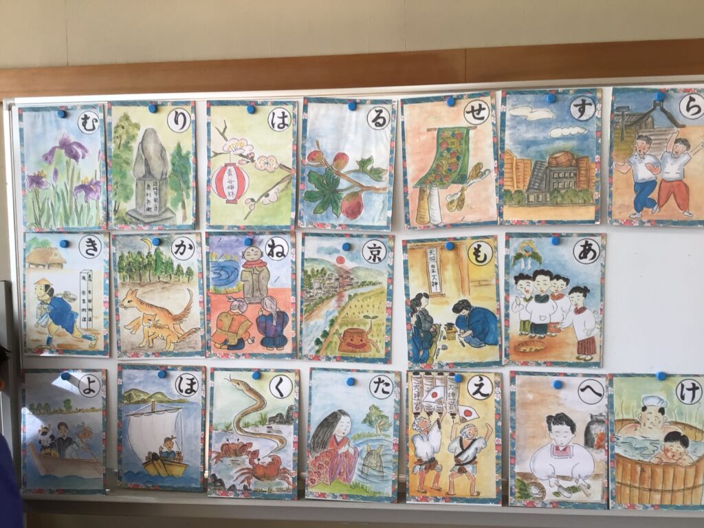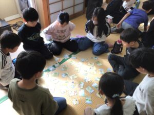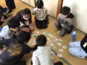 青少健寺田西校区会議の皆さんに来ていただき、「民話とカルタ体験」を行いました。まず、城陽市の特産品等で知っているものを子どもたちが発表していきました。いちじく、梅、花しょうぶ、金銀糸、寺田いも、木津川(渡し船・帆かけ舟)・・・城陽市には有名なものがたくさんあり、それがカルタ一枚一枚になっていることを教えてもらいました。他にも子どもたちが知らなかった城陽のことがカルタに込められていることを知りました。城陽市に伝わっている民話を聞かせてもらい、子どもたちはカルタに興味いっぱいになりました。実際にカルタ大会で盛り上がり、自分たちの地域に誇りと愛着をもてた体験となりました。