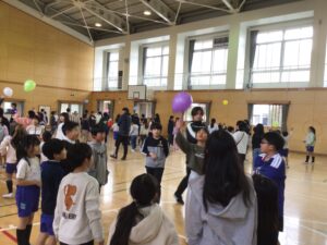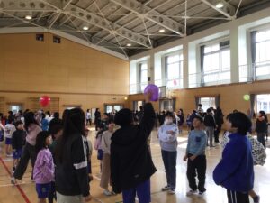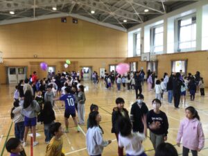 全校行事異年齢集団による活動、スマイル班遊びを行いました。今回の遊びは風船バレーです。ブロック委員会の人たちが『みんなが楽しめる活動を』と考え、企画してくれました。各班で風船を地面に落とさずに何回続けてパスができるかを楽しみながら行いました。どの子もふわりと浮かぶ風船にワクワクしながら班で心を合わせて行っていました。『みんなが楽しめる活動』となり、穏やかな時間となりました。