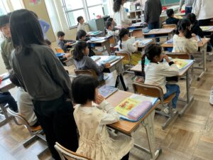 1年の活動1年生は入学して1週間がたちました。朝の用意は6年生のお兄さん、お姉さんが一緒に手伝ってくれています。体育の学習では、「ならびっこ」をしました。教室並び、名簿順、男女別名簿順などいろいろな並び方を練習しました。新しいお友達とも交流して楽しそうに学習していました。