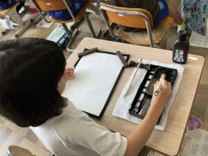 3年生は初めての書写(習字)を行いました。子どもたちはやる前からワクワクしていました。「一」という漢字を始筆と終筆に気を付けて力強く書きました。「楽しい〜。」「できた〜。」という声が職員室まで聞こえてきました。次の書写の学習も楽しみにしている様子でした。