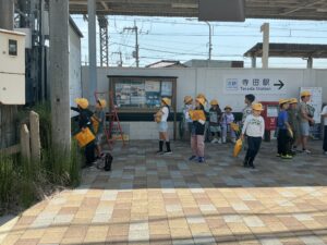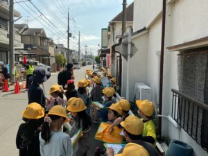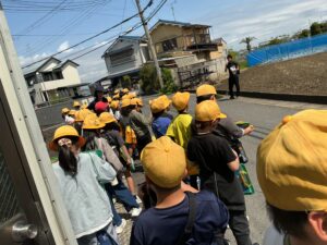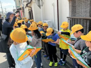 3年生は社会科の学習で校区探検に出かけました。東西南北の方角を学習し、学校の周りを歩いて、校区にはどんな建物や場所があるのかを地図に記していきます。この日は、学校から東に向かい、近鉄寺田駅まで行って、そこから北に歩きました。地図記号を使って病院や田んぼ、畑などを地図に記していきました。今後も校区探検は続きます。
