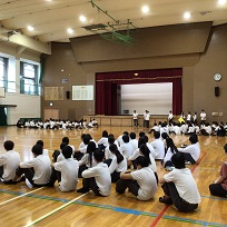 9月25日(木)6時間目に、結団式を行いました。各色の色長を始めとするリーダーの決意表明から始まり、色ごとのスローガンの発表、民舞の縦割りグループごとの交流などを通して、体育祭に向けての士気が高まりました。また、各教室では、民舞で使う扇づくりが行われました。3年生のリーダーが1年生の教室に出向き、作り方を教えていました。2年生は、学年種目で使用する風呂敷(クラス旗)の下書きもしていました。