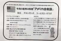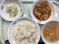 10月16日(木)の給食は、万博記念献立でした。アメリカ合衆国の「チキンガンボ」「コールスローサラダ」でした。スパイスの風味がおいしさの秘密である「チキンガンボ」をご飯にかけていただきました。「2025年大阪・関西万博」開催にちなんだ給食も今日で最後でした。