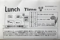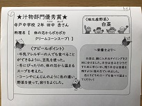 12月3日(水)の給食に、献立コンクール汁物部門で優秀賞に選ばれた2年生の田中さんの献立「体の芯からポカポカクリームコーンスープ」が、提供されました。豆乳を使い、コーンと人参が入った彩りのよいスープでした。今日の寒さにぴったりで、体の芯から温まり、美味しくいただきました。ごちそうさまでした。