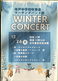 第Ⅱ部は、吹奏楽ステージ。来年の夏のコンクール自由曲のダイジェスト演奏や、クリスマスにちなんだ曲など合計6曲を演奏しました。アンコールでは、定番となった「風になりたい」をダンスを交えて演奏しました。多くの保護者や寺中生が来場し、素敵なコンサートとなりました。ご来場いただいた皆さん、ありがとうございました。