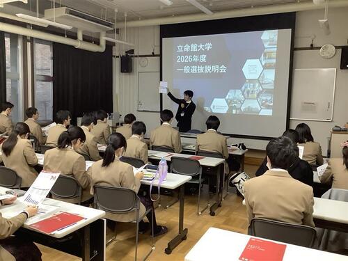 11月18日(火)の放課後に、立命館大学入学センターの方をお招きし、一般入試説明会を開催しました。一般入試の基本的な仕組みや昨年度入試のデータに加え、出願方法の戦略などもレクチャーいただきました。一般入試を目前に控えた時期の説明会ということもあり、参加者一同、入試データと自分の実力と照らし合わせながら、真剣な眼差しで受講していました。進路指導部も引き続き、生徒の希望進路実現に向けてサポートしていきます。