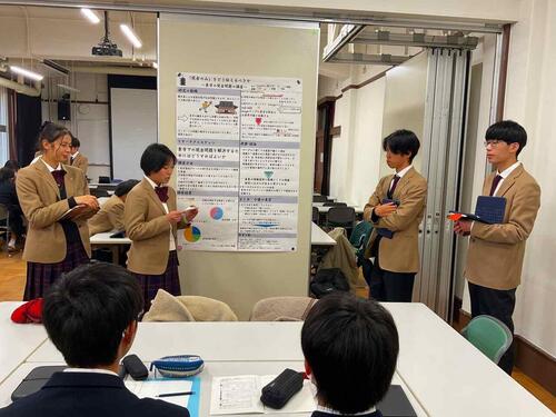 1月28日(水)、堀川高校人文社会ゼミの生徒11名が来校し、本校1・2年生の計4チームと探究活動の交流を行いました。同じ高校生同士とはいえ、他校の生徒を前にした発表には自然と緊張感が漂いましたが、すぐになじんで自分の言葉で探究内容や考えを、丁寧に伝えていました。交流では、本校生徒が堀川高校の生徒の探究内容に対して率直な質問や意見を投げかける場面も多く見られました。互いの視点や考え方の違いに触れることで、探究の深まりや新たな気づきが生まれ、意欲をかきたてられる有意義な時間となり、最後は時間が足りないくらい話が弾みました。