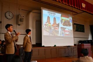 続いて行われた3年生のプレゼンでは、フランス短期交換留学や海外研修、全国フォーラムへの挑戦など、リアルな体験談が語られました。リアルな体験談を語る先輩の姿に、1年生は「自分もいつか!」と刺激を受けてもらえたのではないでしょうか。