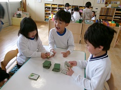7日の発表参観に向けての活動にはりきって取り組んでいるそら組ですが、外遊びや室内遊びも大好きで楽しんでいます。今、人気があるのは“ぼうずめくり”です。ぼうずの札が出たら、「あ〜!ぼうずや〜。」と残念な様子、お姫様が出たら「やった〜。」と大...