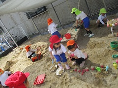 砂場ではアイスクリーム屋さんやカップケーキ屋さんでにぎわっていました。砂でつくったアイスクリームやケーキに小石や木の実を可愛らしくトッピングをしていましたよ。「いらっしゃいませ〜!」「チョコとバニラがおすすめです!」とお友だちとのやりとり...