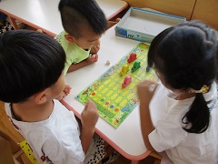 今日の出来事 友達と一緒に(2025.10.08) 10月になりましたが、暑い日が続いています。戸外で遊んだ後は室内でほっこり。ほし組は少しずつ友達と一緒にルールのある遊びの面白さを感じ、楽しめるようになってきています。「次○○ちゃんね。」「もうすぐゴールや!」とゲーム遊びを楽しみました。... 2025.10.08 今日の出来事