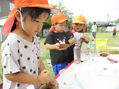 今日の出来事 ジュースできた(2025.10.14) 花や葉を使い、ジュースづくりを楽しんでいます。ほし組の子どもたちは美味しそうにつくるコツをつかんだようで、すりこぎ棒を使い鮮やかな色をつくり、友達と見せ合ったり一緒につくったりしています。繰り返し試すことで気付き、成長している子どもたちで... 2025.10.14 今日の出来事