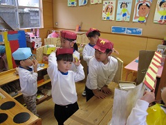 今日の出来事 マクドナルド、今日もオープン中!(2025.10.22) 毎日休みなしでマクドナルドがオープンしています。にじ組ほし組の子どもたちも毎日来てくれます。少しずつ「お店の人になりたいなあ。」という声が、にじ組ほし組からも出てきて、いろいろなクラスの子どもたちが一緒に店員になって楽しむ姿が見られていま... 2025.10.22 今日の出来事