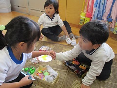 今日の出来事 今日はどこにしようかな(2025.11.11) ケーキやお弁当、マクドナルドなどを持ち寄り、今日もピクニックに出かける子どもたち。「どこに行く?」「お部屋にシート広げる?」と自分たちでシートなど必要な道具をもって相談しています。場所が決まると「これ食べる?」「はい、これもおいしいよ。」... 2025.11.11 今日の出来事